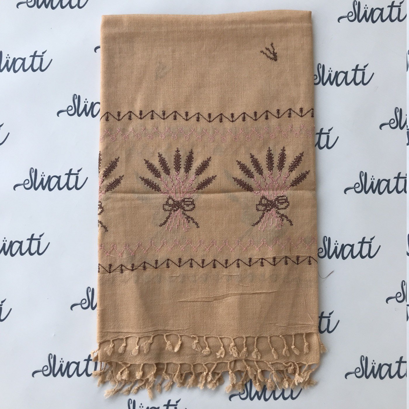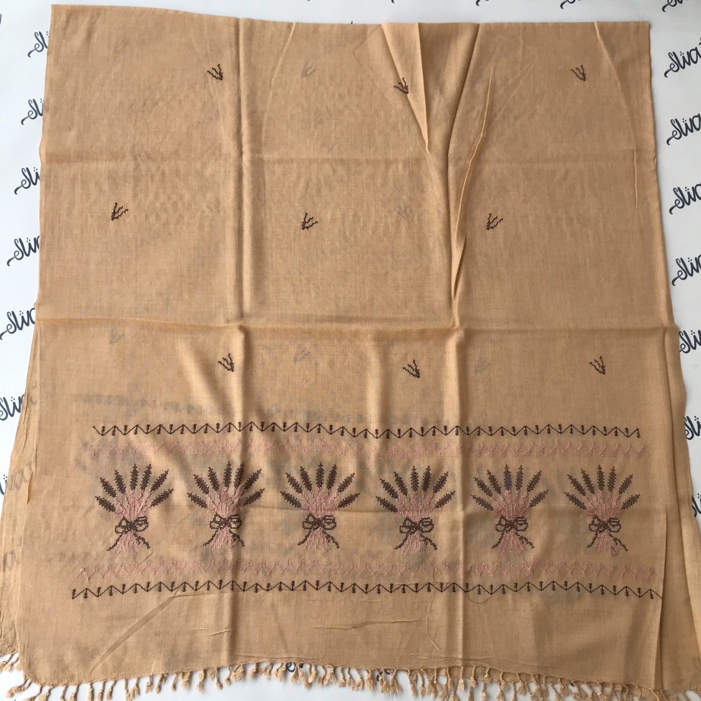 What truly sets this shawl apart is the machine embroidery in pink and dark brown. The embroidery adds a layer of elegance and sophistication to the design, creating a beautiful contrast against the cream wool. The embroidery is delicate yet bold, with its fine stitching and intricate patterns, making each piece truly unique. The pink and dark brown color scheme gives the shawl a refined, earthy aesthetic that is both classic and contemporary.