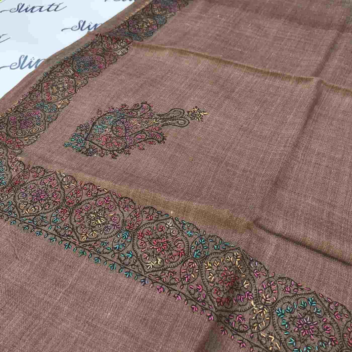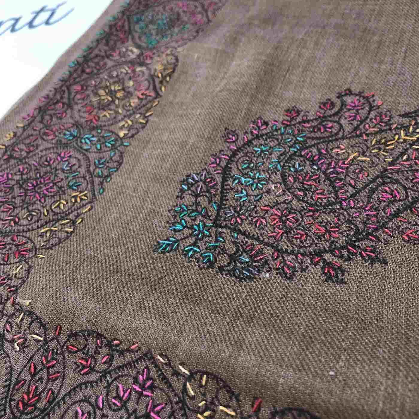 The highlight of this exquisite women’s shawl is its intricate multicolor embroidery along the borders. Each stitch reflects the skill and craftsmanship of Swati artisans, who are known for their attention to detail and artistic designs. The vibrant embroidery patterns, inspired by traditional motifs, create a striking contrast against the dark brown background, adding depth and character to the shawl.