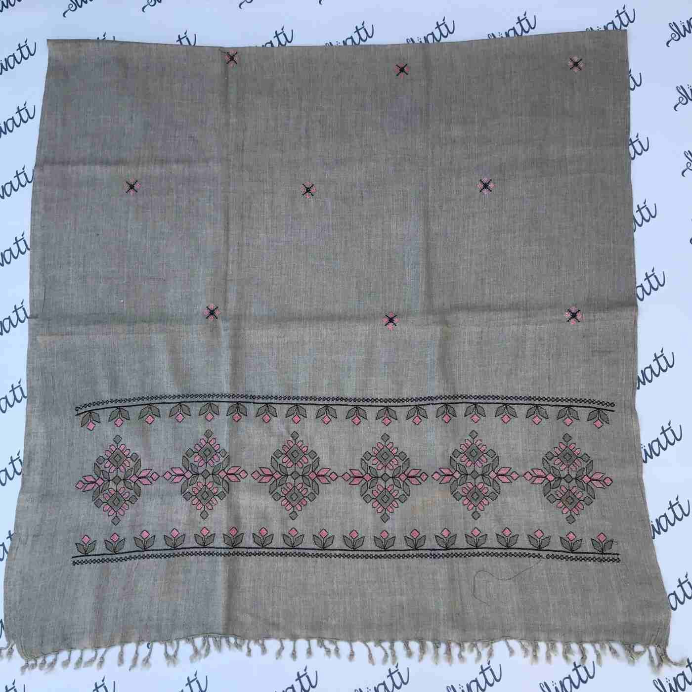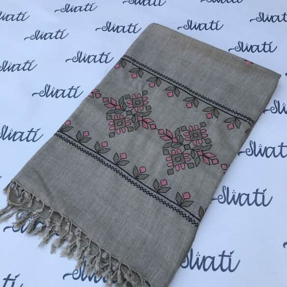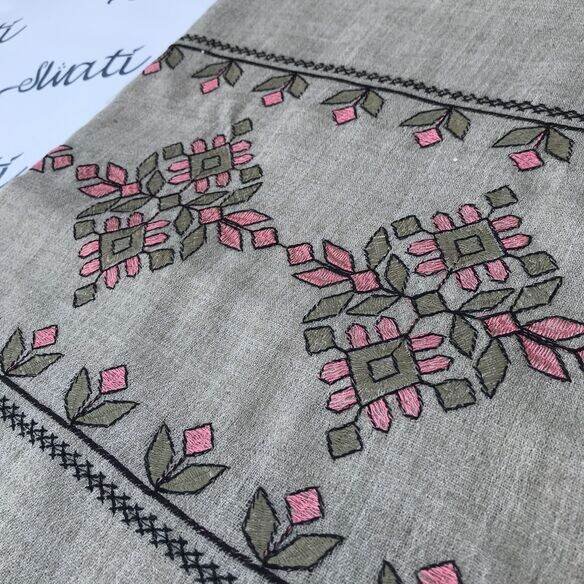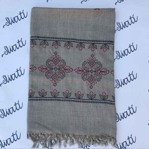 The gentle grey wool base serves as a perfect canvas for the pink and green embroidery, creating a stunning contrast that reflects the rich tradition of Swati embroidery. Every thread tells a story of heritage, artistry, and care, making each handmade shawl a one-of-a-kind piece. The intricate patterns are inspired by traditional motifs from the Swat Valley — known for its centuries-old craftsmanship and attention to detail.