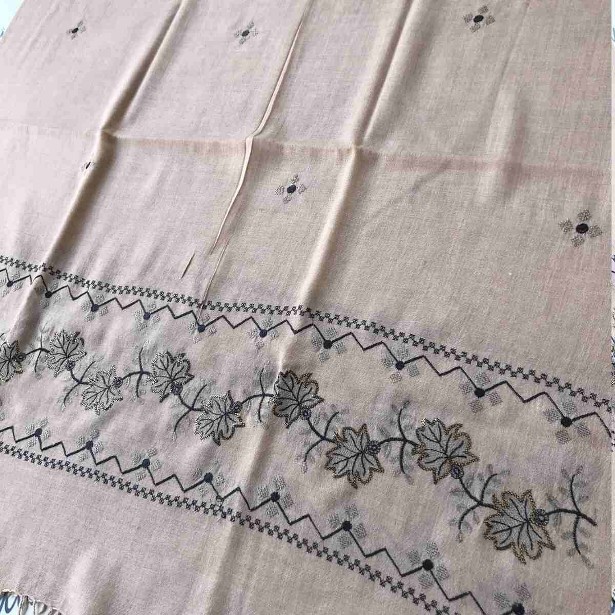 What sets this shawl apart is the intricate black machine embroidery that adorns the light cream fabric. The black embroidery adds a bold contrast to the soft, neutral tones of the shawl, creating a visually striking and modern design. Machine embroidery is a highly precise technique, allowing for detailed patterns that are both durable and beautiful. The use of black thread on the cream fabric creates an elegant, timeless look, making this shawl a versatile accessory that pairs well with a variety of outfits.