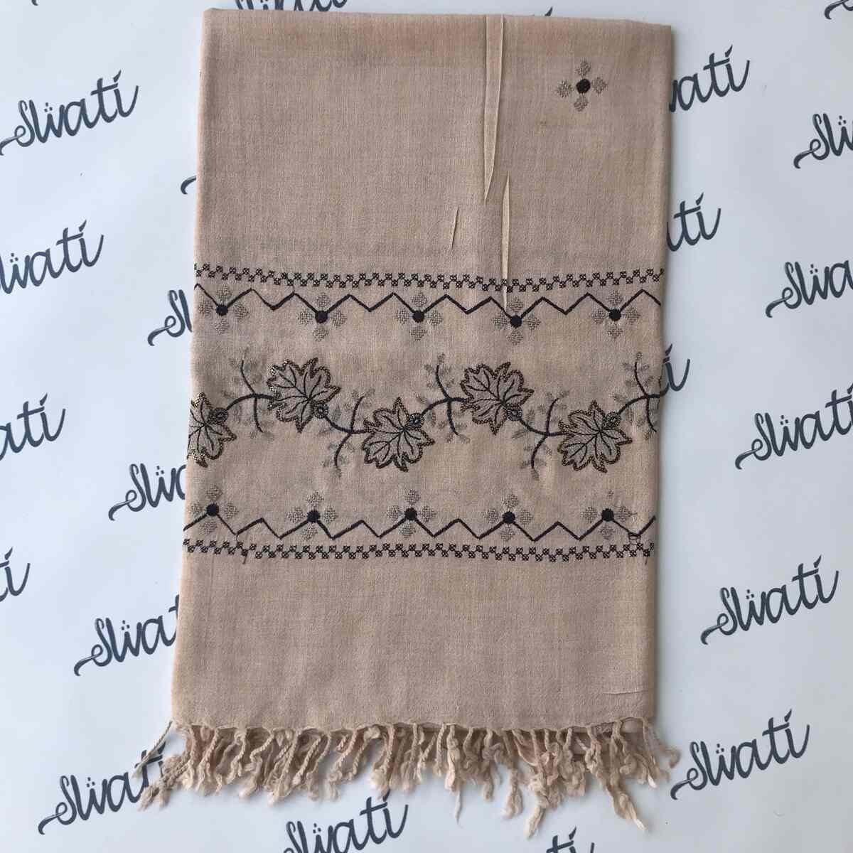 The embroidery itself features delicate and intricate designs that give the shawl a unique and artistic touch. The black threads stand out against the light cream background, adding a layer of depth and visual appeal to the fabric. This combination of colors and textures elevates the shawl, transforming it from a simple winter accessory to a true statement piece. Whether you’re dressing up for a special occasion or adding a touch of elegance to your everyday attire, the Swati shawl with black machine embroidery ensures you stand out in style.
